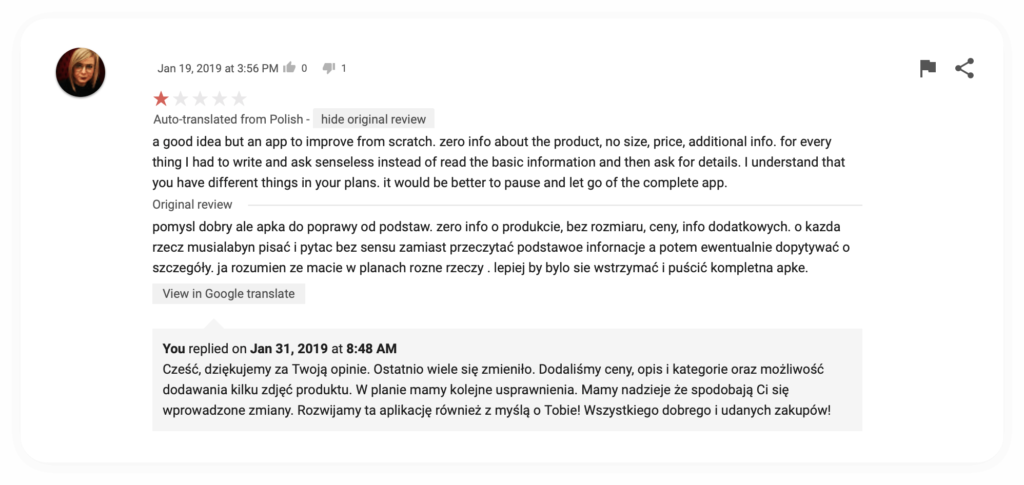 We got four 1-star reviews on Google Play. Below you can see one of them.