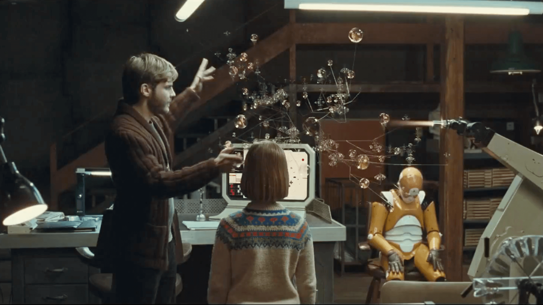 In the “Eva” (2011) movie, Daniel Brühl is playing a genius who was employed by his former university to design AI for robots. There is a scene when he is at home in his workshop.